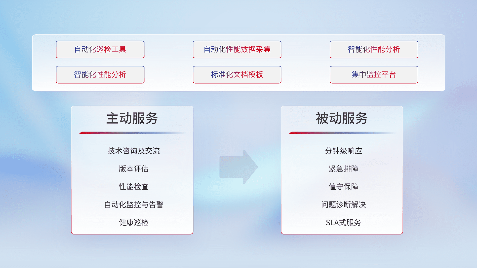 智能化工具和标准化文档,,保障服务质量,,提供主动服务(包含技术咨询、、、、版本评估、、性能检查、、自动化监控与告警、、、健康巡检)和被动服务包含(分钟级响应、、、、紧急排障、、、、值守保障、、、、问题诊断解决、、SLA服务)。。