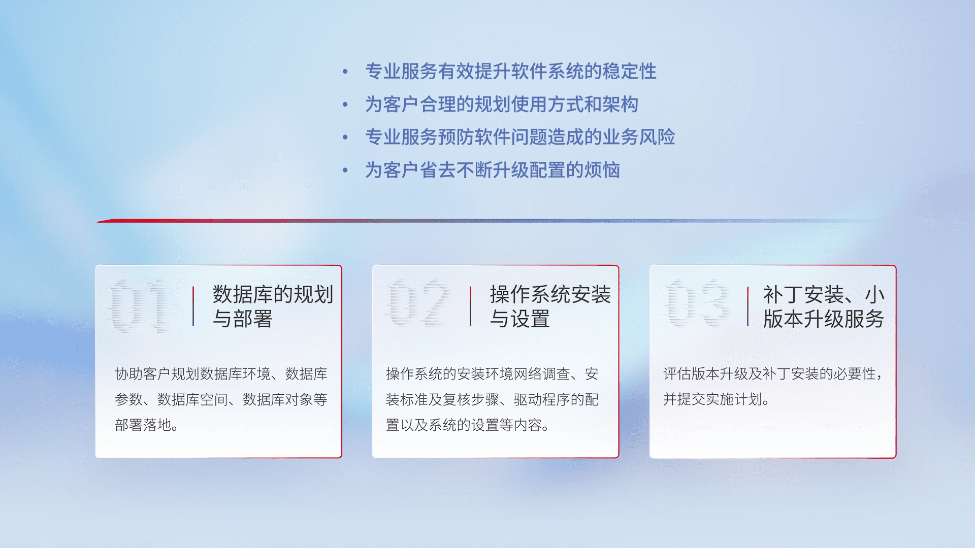 为客户提供软件规模升级、、快速部署、、按需配置的专业服务,,,,从数据库的规划与部署到操作系统的安装与设置,,,再到补丁安装和小版本升级提供支持。。。